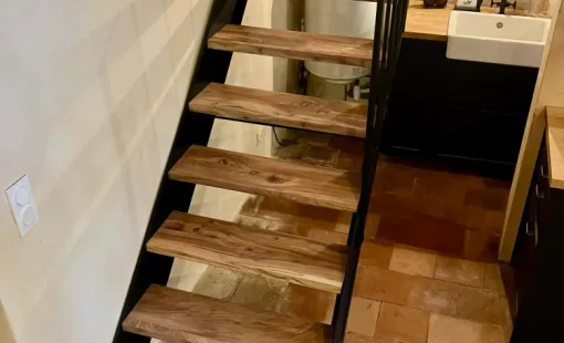 Votre menuisier agenceur vous présente la Fabrication marche d'escalier en hévéa à Figarol et ses alentours.
